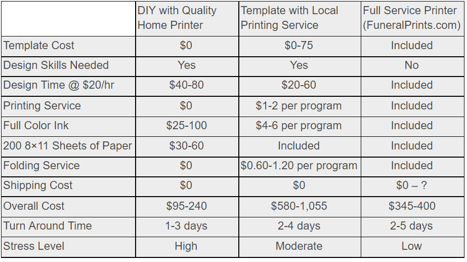 Let’s look at the options for funeral programs and compare the cost, demand on your time, and personalization to help identify the best fit for you.